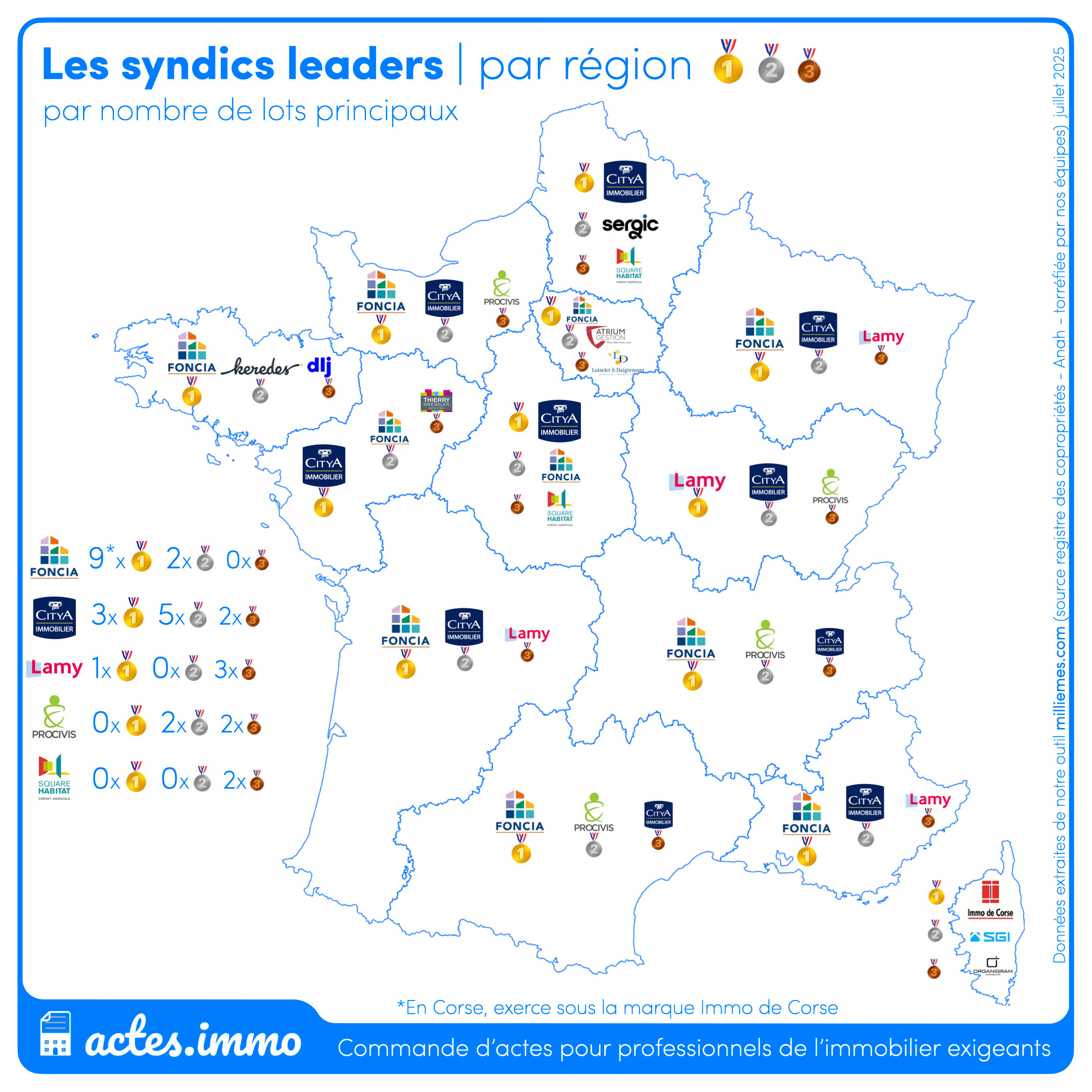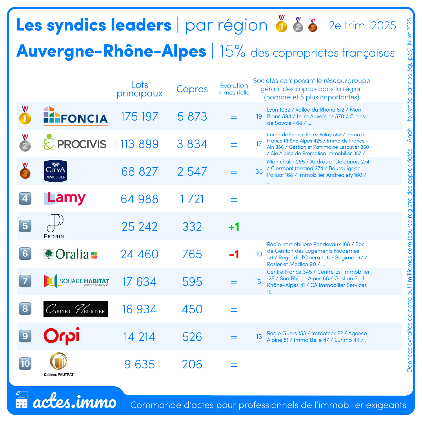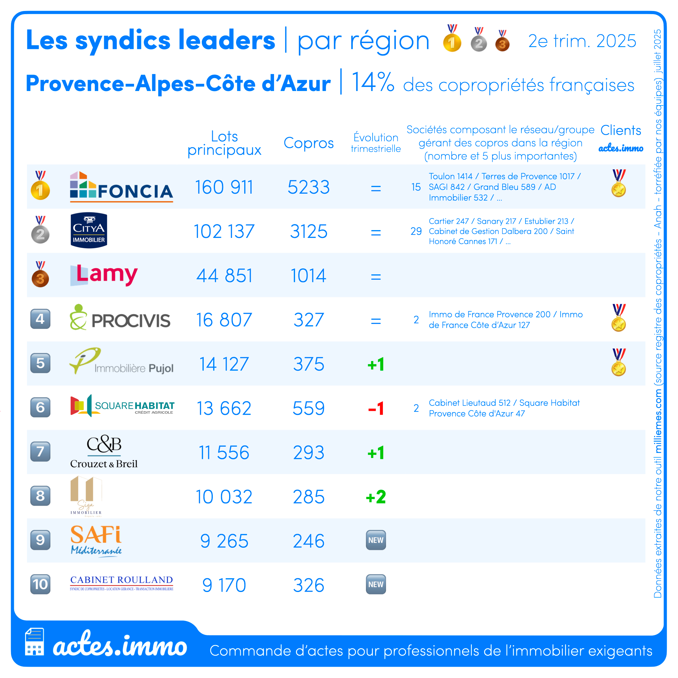 13 régions métropolitaines, top 10 par région, 74 syndics différents