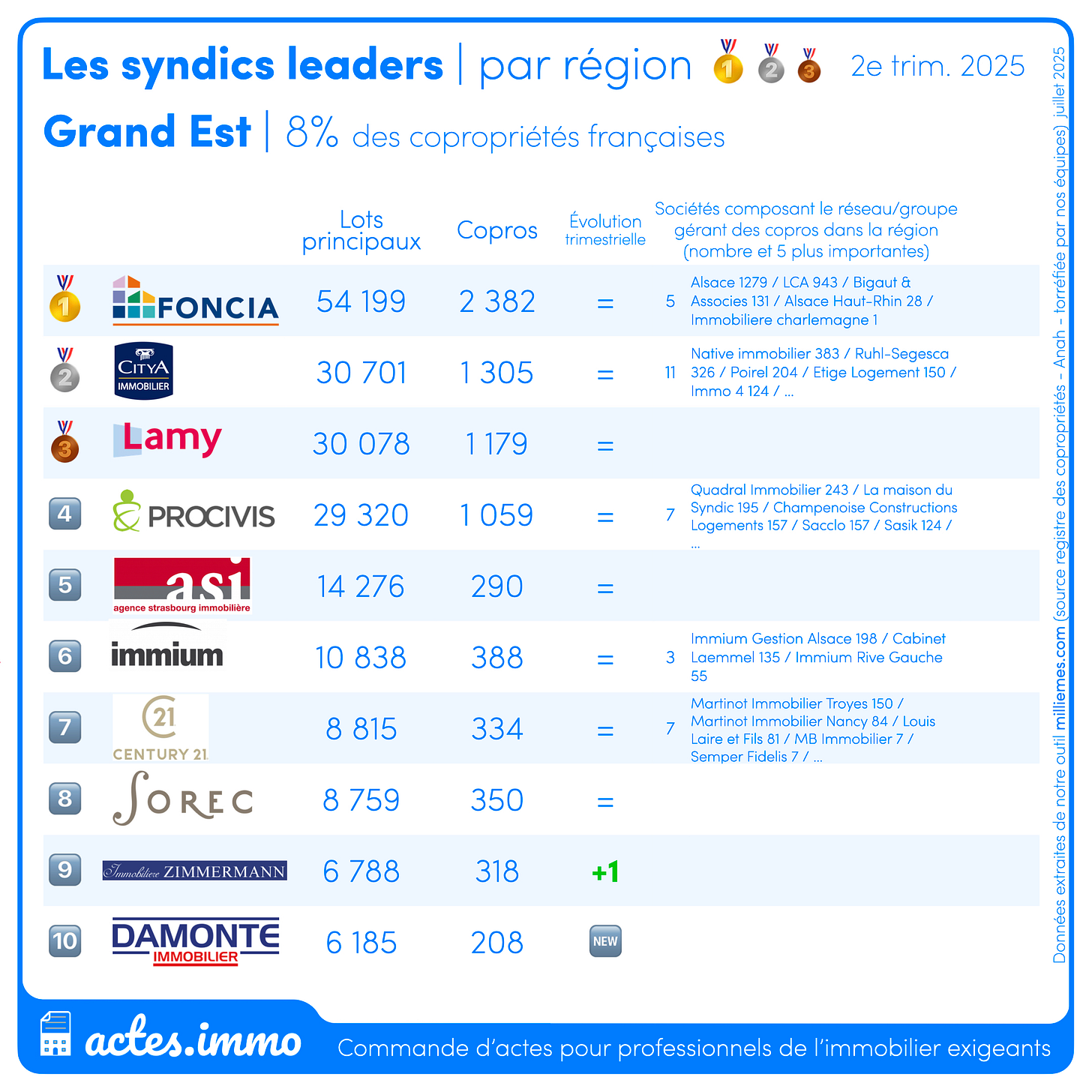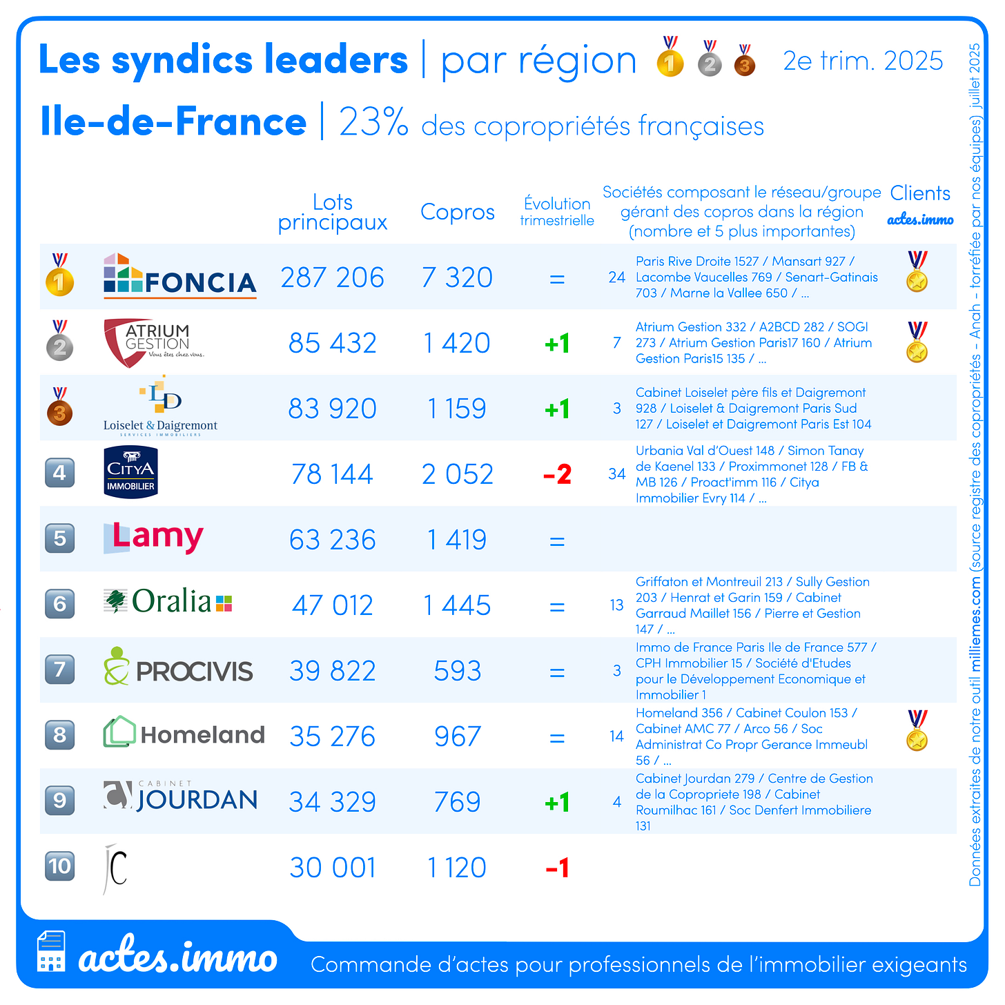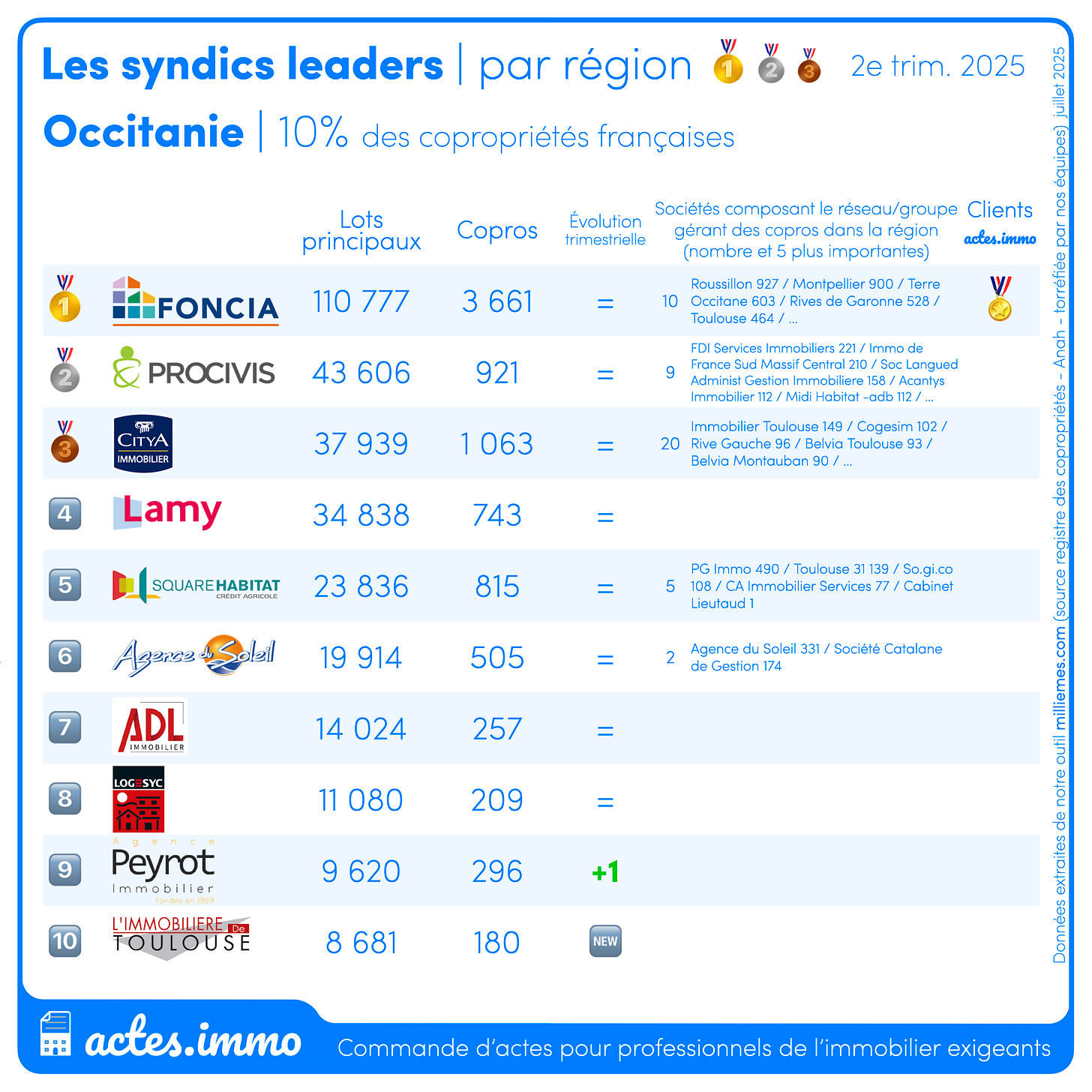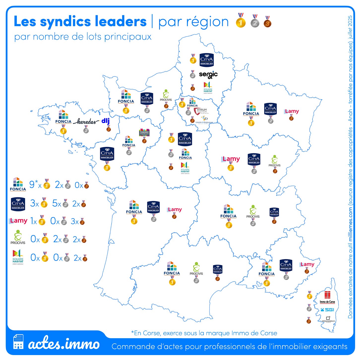 13 régions métropolitaines, top 10 par région, 74 syndics différents