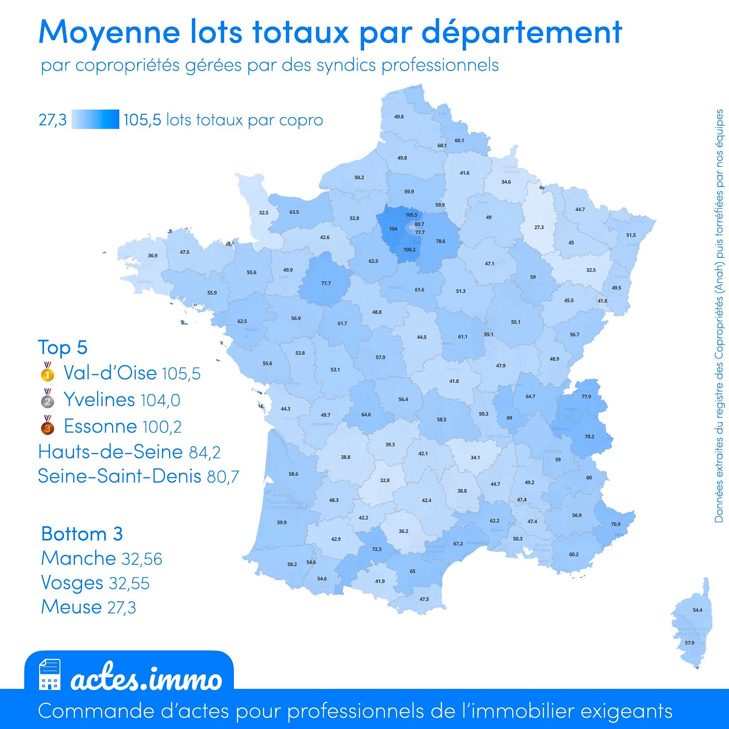 Quels sont les départements où le nombre moyen de lots de copropriétés gérées par un syndic pro est le plus élevé ?