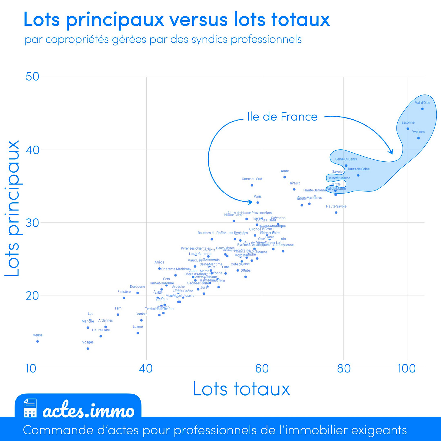 L’Ile-de-France est en tête du nombre de lots (à l’exception de Paris => moins d’espace, des copropriétés plus petite qu’en proche banlieue parisienne).