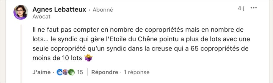 Suite à l’édition #6 sur le nombre moyen de copropriétés par syndic, Maître Agnès Lebatteux a partagé une remarque très juste sur LinkedIn :
